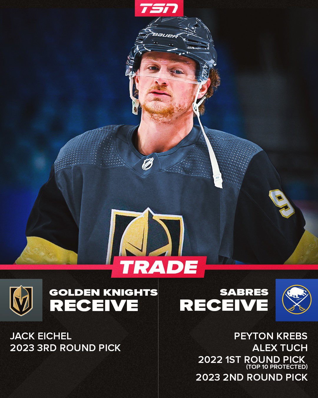The deal also includes a first-round pick in 2022 and a third. The Buffalo Sabres have acquired forwards Peyton Krebs and Alex Tuch a top-10 protected 2022 first-round pick and a. In the early hours of Thursday morning everyone knew that Jack Eichel had been traded to the Vegas Golden Knights from the Buffalo Sabres but the details of.